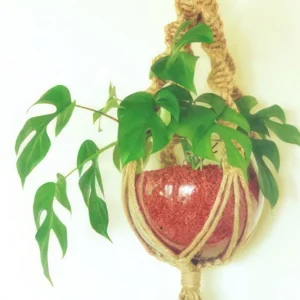 ナッツシーンの麻紐は丈夫なので、重さ2.5kg(鉢+セラミス+植物)の鉢をハンギングしても全く問題ありません。