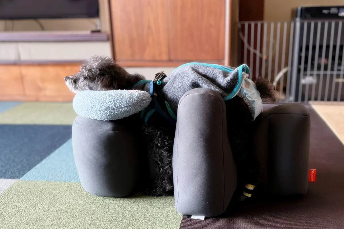 また、興奮したPをクールダウンさせる時や、歯磨きやブラッシングなどお手入れをする時、飼い主の用事で「ちょっと待っててね」をする時…などなど、あらゆる場面でPの脚代わり(?)になってくれるから、すごくありがたいのです。