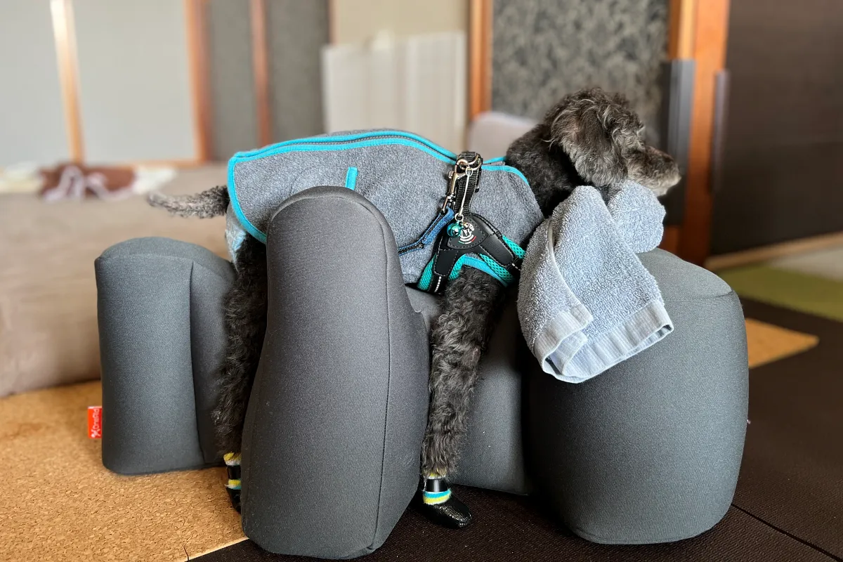 実は、歩行補助アイテムとして犬用車いすもご紹介する予定でしたが、ドクターストップが出てしまい(Pは認知症が進行していて、今はもう「新しいこと=車いすを使って歩くこと」を覚えて脳を刺激する段階ではない、とのこと)できなくなってしまいました。残念!