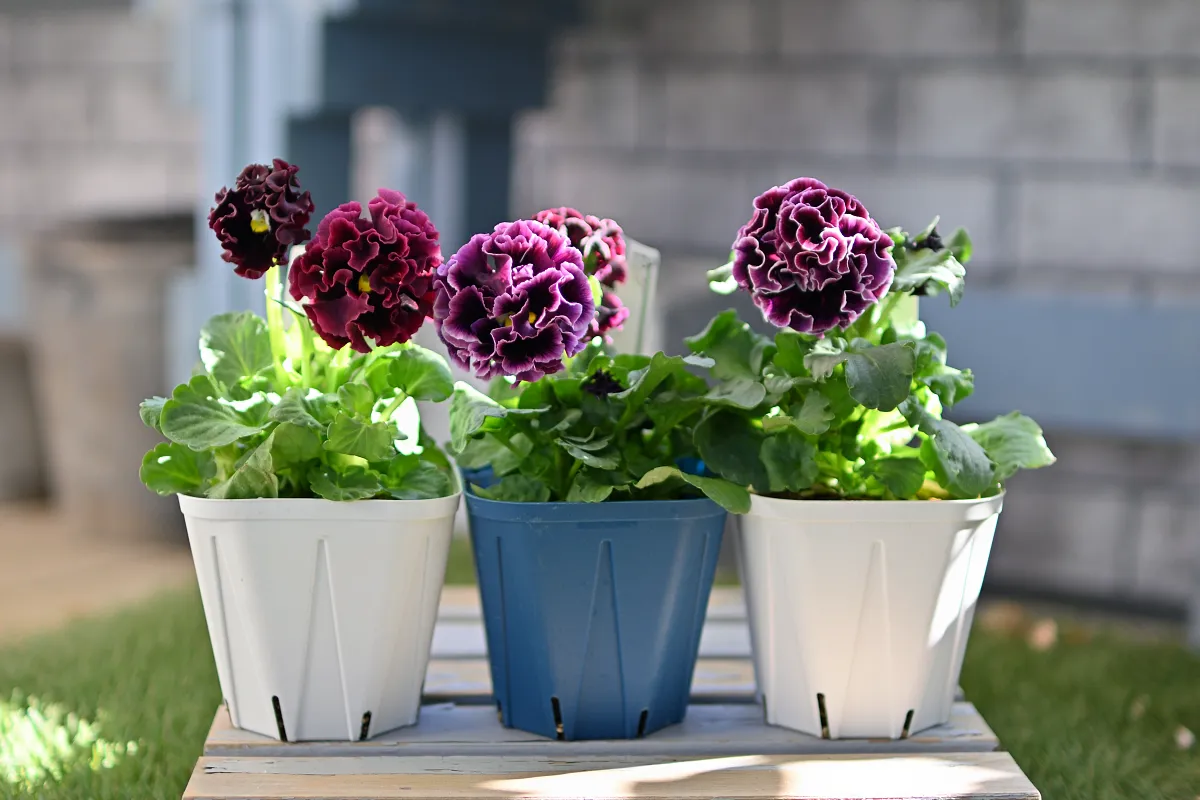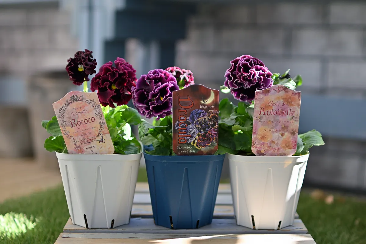 下の画像のパンジーは全部品種が違うんですけど(ドラキュラ、ローブドゥアントワネット、ローブドゥアントワネットロココ)、どれがどれか分かりますか?